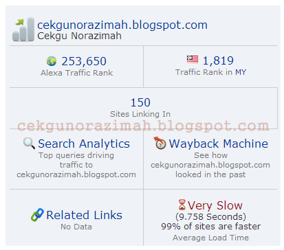CN dah tukar URL BLOG dari cikgunorazimah.blogspot.com kepada www.cekgunorazimah.com sama seperti pindah rumah baru so memang automatik ranking alexa blog tak wujud dah. ranking itu hanya ada kat url asal.